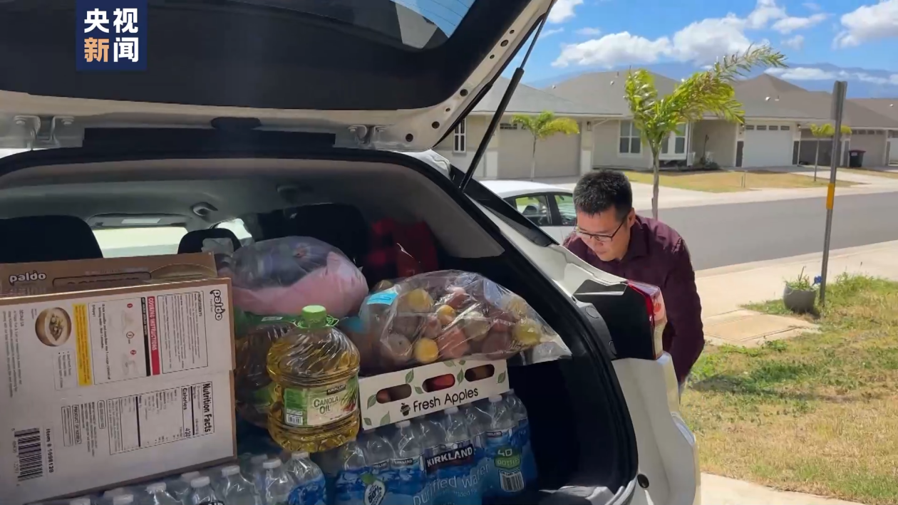 央视记者刘旭:我们到了拉海纳镇地区之后,燃烧最严重的那片区域仍然是被封闭、不允许进入的。因为我们车上也带了一些救援物资,我们先来到了拉海纳对面的购物中心。很多车都在排队等候捐赠救援物资,我们也在这里等候。