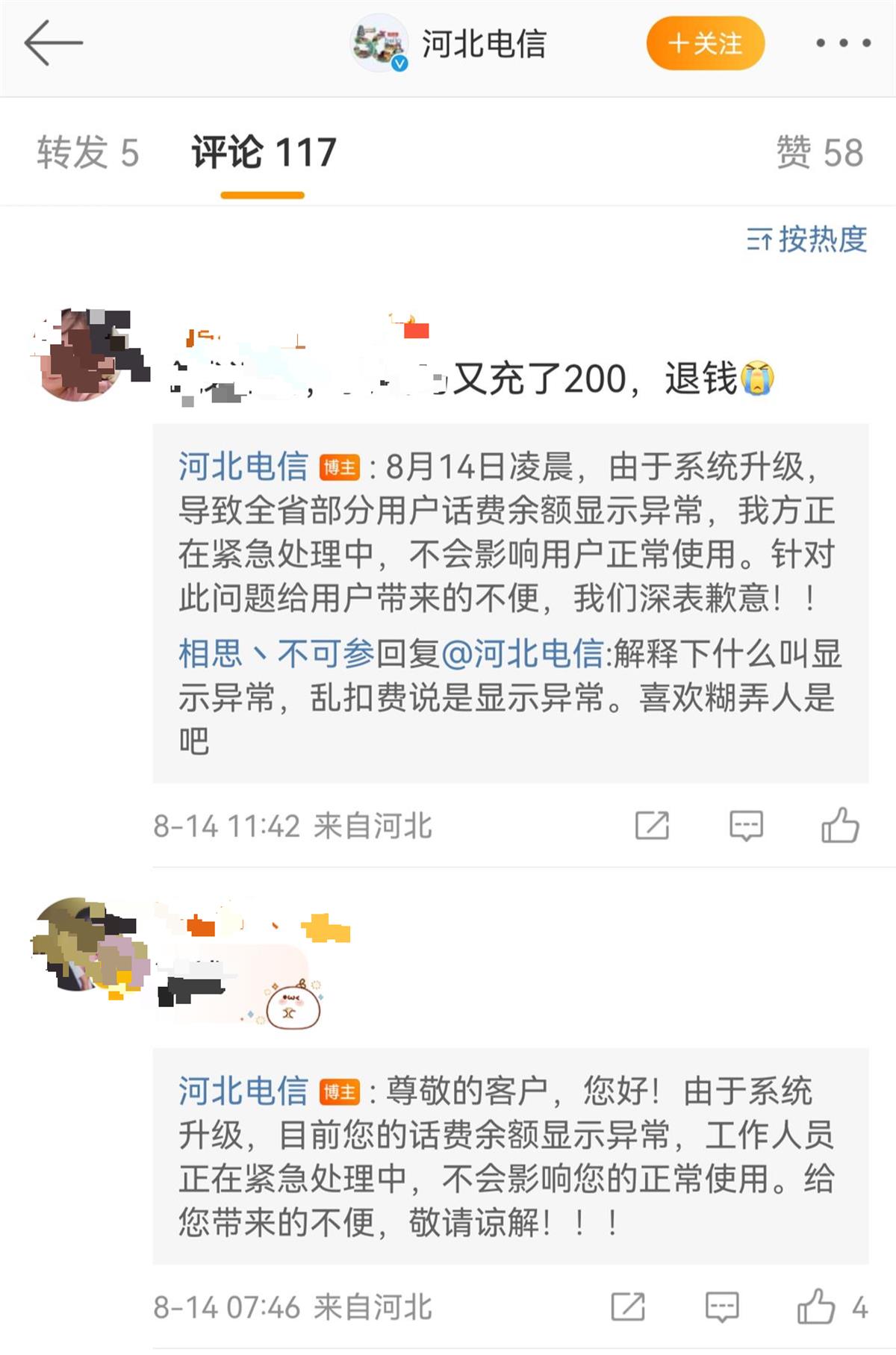 极目新闻记者注意到,在“河北电信”官方微博评论区,不少网友评论询问此事。河北电信回复称由于系统升级,导致全省部分用户花费余额显示异常,电信方正在紧急处理中。
