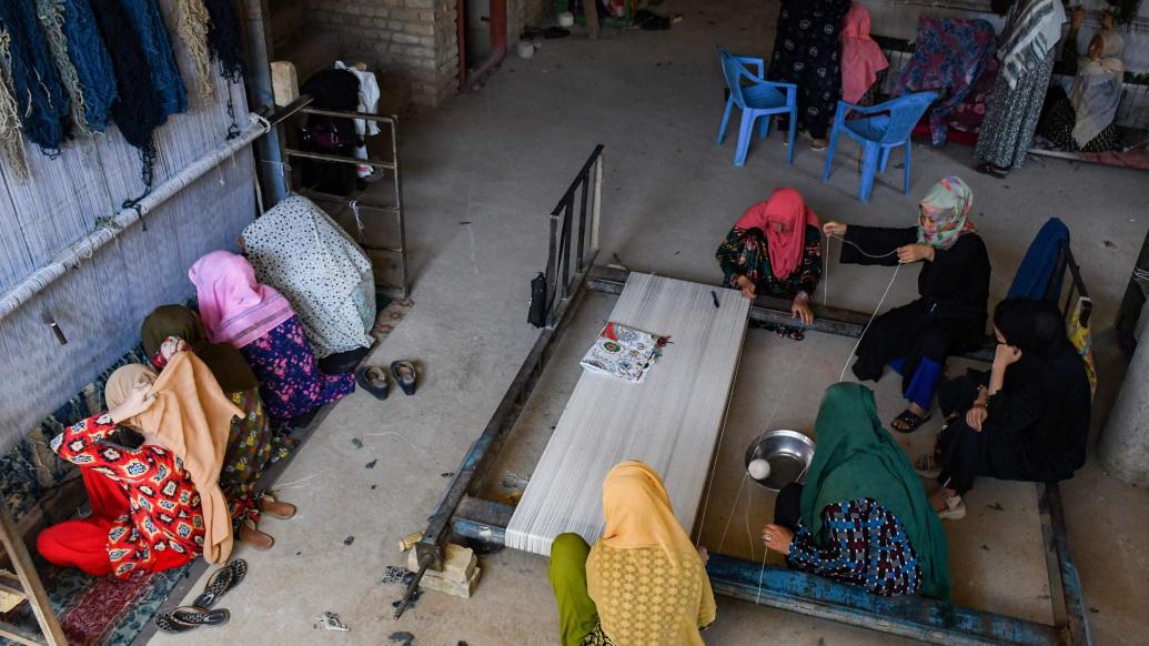 当地时间2023年8月10日,阿富汗马扎里沙里夫,妇女在织地毯。视觉中国图