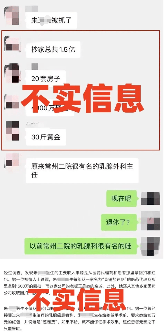 8月10日,常州市广播电视台微信公众号“中吴网”发布消息表示,关于乳腺外科医师朱某某相关谣言严重失实。此前,有网传消息称,常州市第二人民医院医生朱某某被查,其家中查出巨额财产。