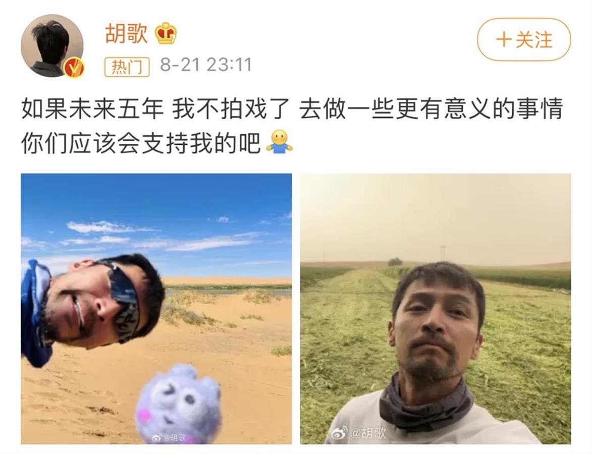 或许,在眼下这个时间点,“不拍戏了,去做一些更有意义的事情”,更能让胡歌感到“不虚此行”。