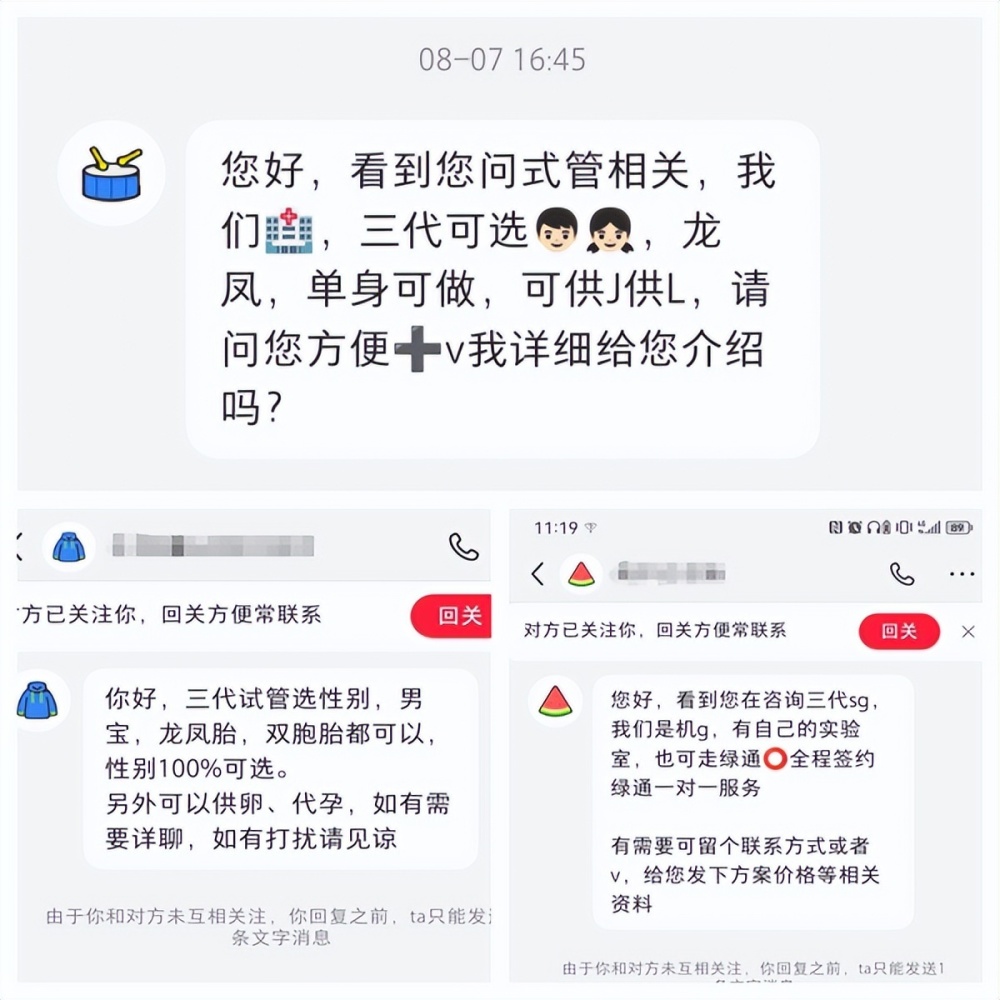 目前,市面上是否存在未取得相关资质但还是打着“助孕”旗号私下进行辅助生殖活动的经营行为?华商报记者前期在网络中调查发现,这些非法“助孕”机构在日常经营中相当谨慎,网络中几乎看不到任何广告宣传信息。记者在小红书App搜索“试管婴儿”发现,其中推送出不少宣传试管婴儿机构的“软广告”,在下方留言跟帖后就有热心“网友”私信,这些用户类似“医托”,聊天不久后便会推来助孕机构的联系方式。