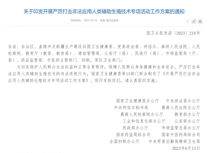 近日,国家卫生健康委等14部门联合发布《开展严厉打击非法应用人类辅助生殖技术专项活动工作方案》,于2023年6月至12月在全国范围内严厉打击非法应用人类辅助生殖技术专项活动,重点抽查阶段在8至10月。