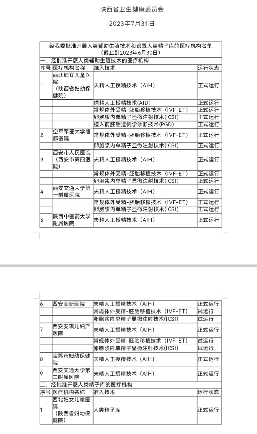据国家卫健委公布的数据,截至2022年底,我国经批准开展人类辅助生殖技术的医疗机构已达559家。据陕西省卫健委7月31日公布的名单显示,截至今年6月30日,陕西经批准开展人类辅助生殖技术的医疗机构共有9家,分别为西北妇女儿童医院(陕西省妇幼保健院)、空军军医大学唐都医院、西安市人民医院(西安市第四医院)、西安交通大学第一附属医院、陕西中医药大学附属医院、西安高新医院、西安安琪儿妇产医院、宝鸡市妇幼保健院和西安交通大学第二附属医院。