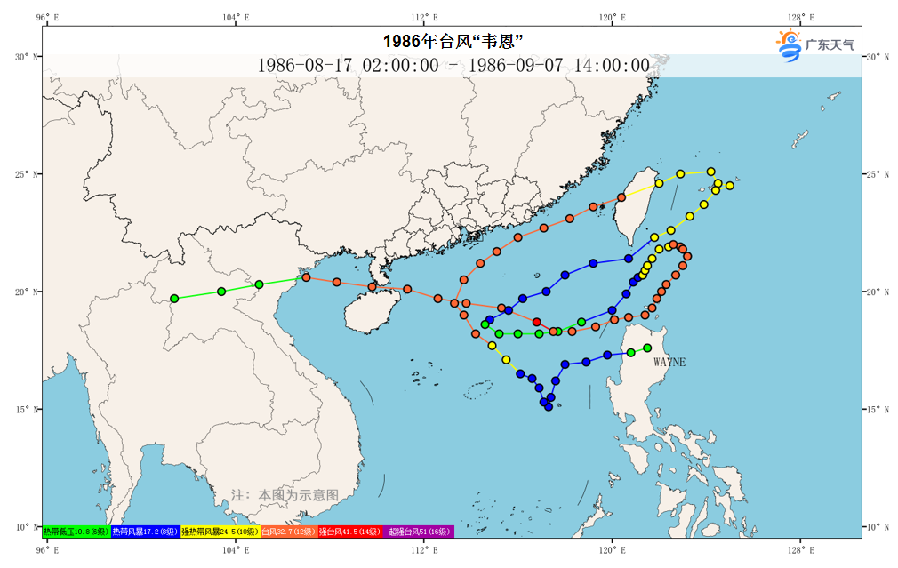 比如,1986年台风“韦恩”,从8月16日到9月6日两次加强和减弱,三次180°转向,其路径之错综复杂堪称“奇葩路径的鼻祖”,整整走了21天!不停的在打圈。