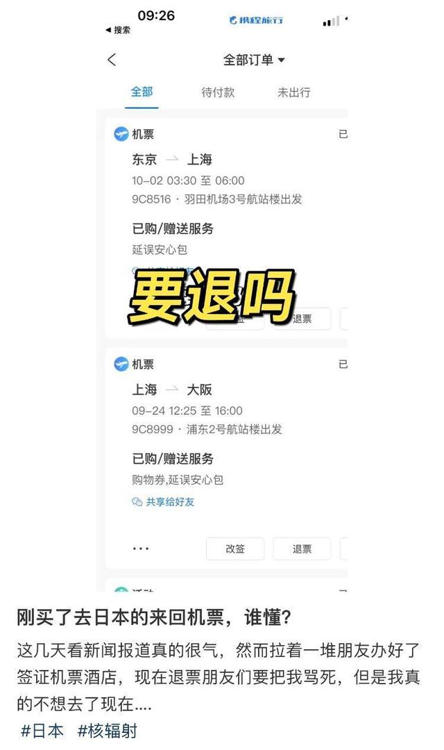 记者亦发现,已有游客做出退机票的决定。“本来前几个月很开心国庆买到了两个人往返才5330的机票,但看到排放核污染水的新闻还是打算不去了。”在该条信息评论区下,有网友评论称,“我也退了,前几天纠结得睡觉都睡不好。”