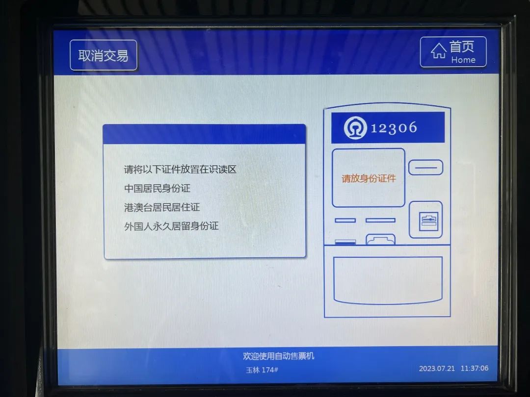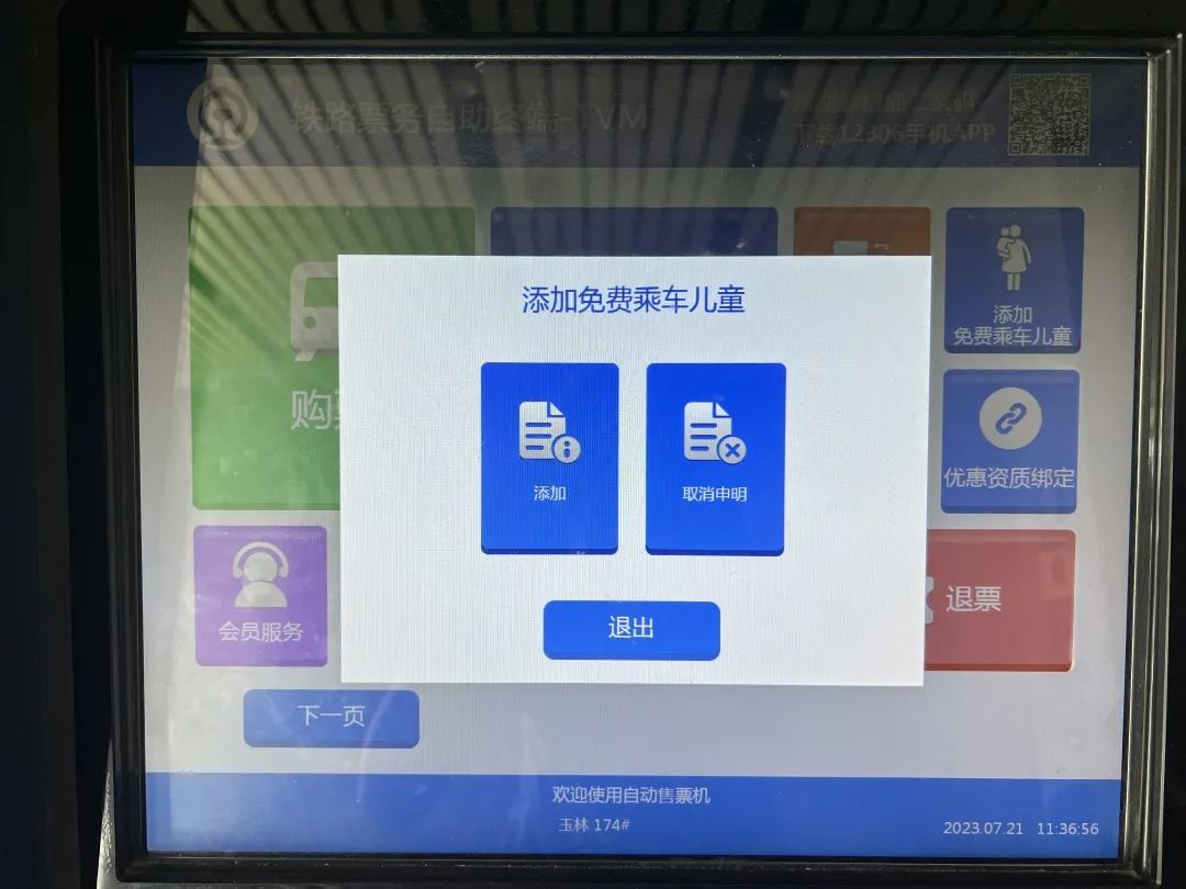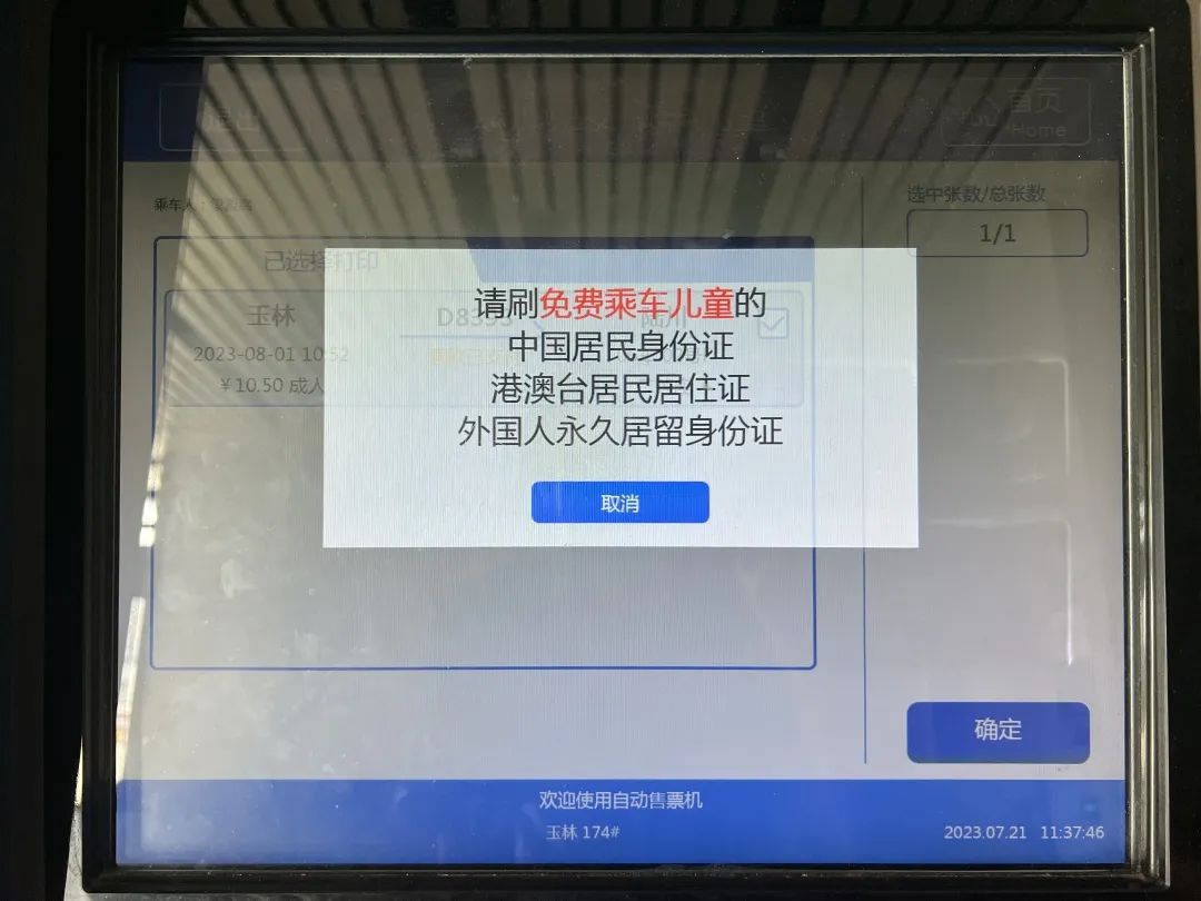在自助售取票机取消申明时,既可读取成人证件,也可读取免费乘车儿童证件,查询已申明的订单,选择订单后可取消申明。