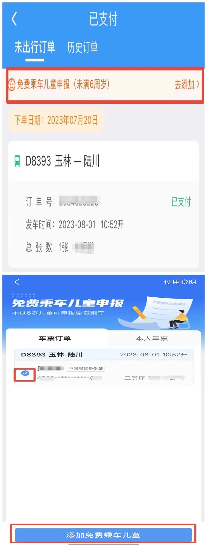 用户购票完成后,在铁路12306App中的“火车票订单”或“本人车票”中,按步骤提示进行免费乘车儿童申报操作即可。
