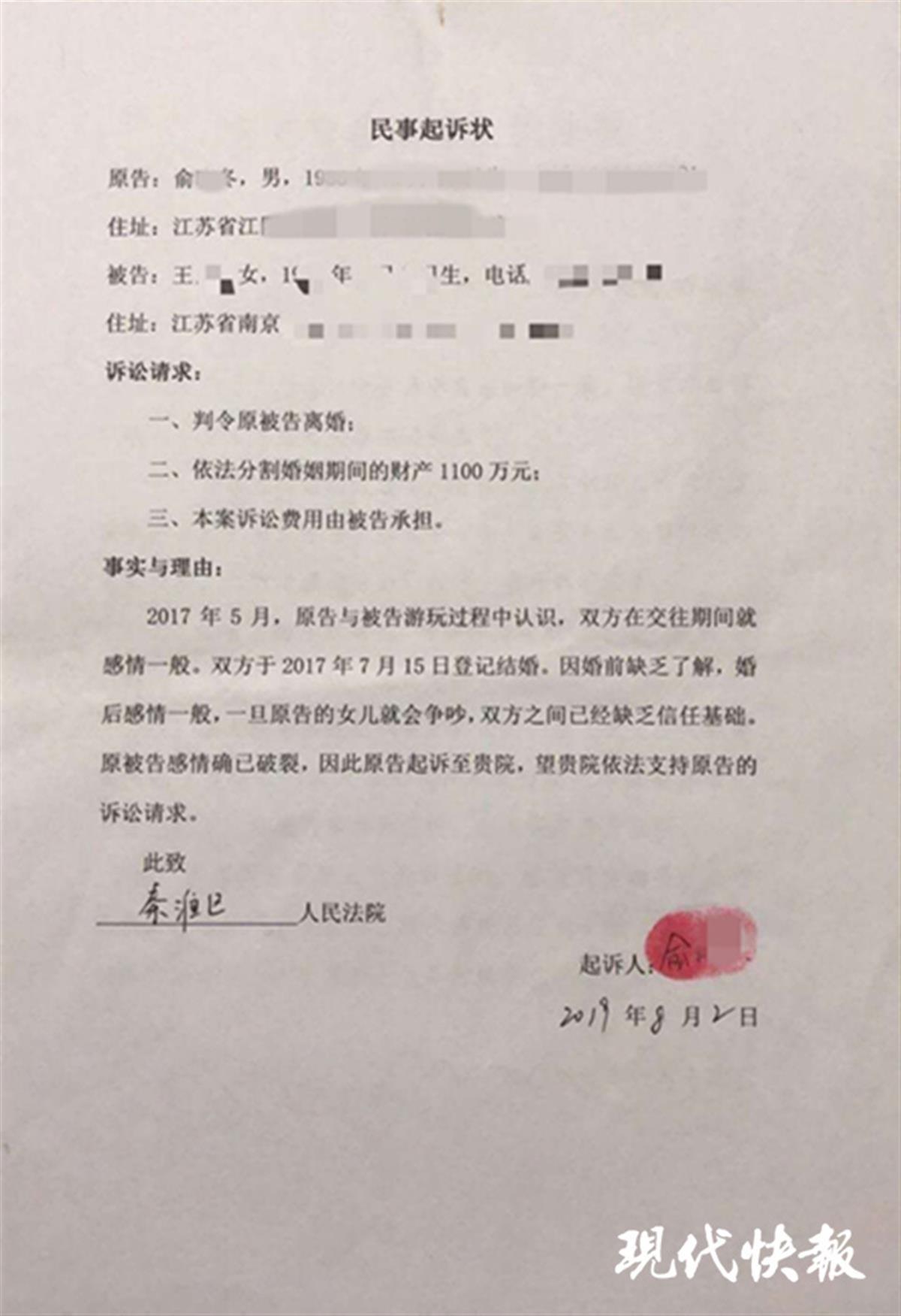 现代快报记者了解到,2019年8月2日,就在坠崖后1个月多,俞某冬曾向法院提起离婚,并提出了财产分割等诉求。根据王暖暖提供的南京市秦淮区人民法院传票、应诉通知书、俞某冬的起诉状等文件,2019年8月2日,俞某冬将王女士诉至秦淮区人民法院,请求法庭判令双方离婚,并依法分割婚姻期间的财产1100万元。