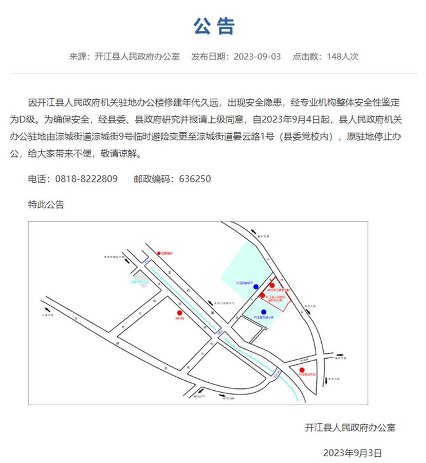 前述公告显示,因开江县人民政府机关驻地办公楼修建年代久远,出现安全隐患,经专业机构整体安全性鉴定为D级。为确保安全,经县委、县政府研究并报请上级同意,自2023年9月4日起,县人民政府机关办公驻地由淙城街道淙城街9号临时避险变更至淙城街道晏云路1号(县委党校内),原驻地停止办公。