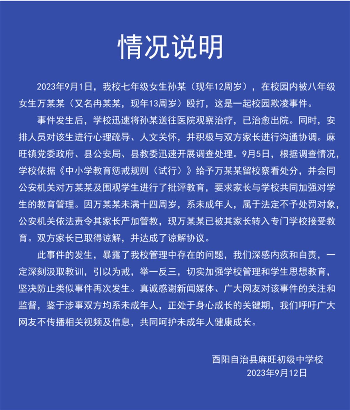 酉阳县教委工作人员告诉极目新闻记者,已经就此事发布了事件最新进展。落款为麻旺初级中学校9月12日发布的情况说明显示,2023年9月1日,该校七年级女生孙某(现年12周岁),在校园内被八年级女生万某某(又名冉某某,现年13周岁)殴打。该情况说明也就此定性,这是一起校园欺凌事件。