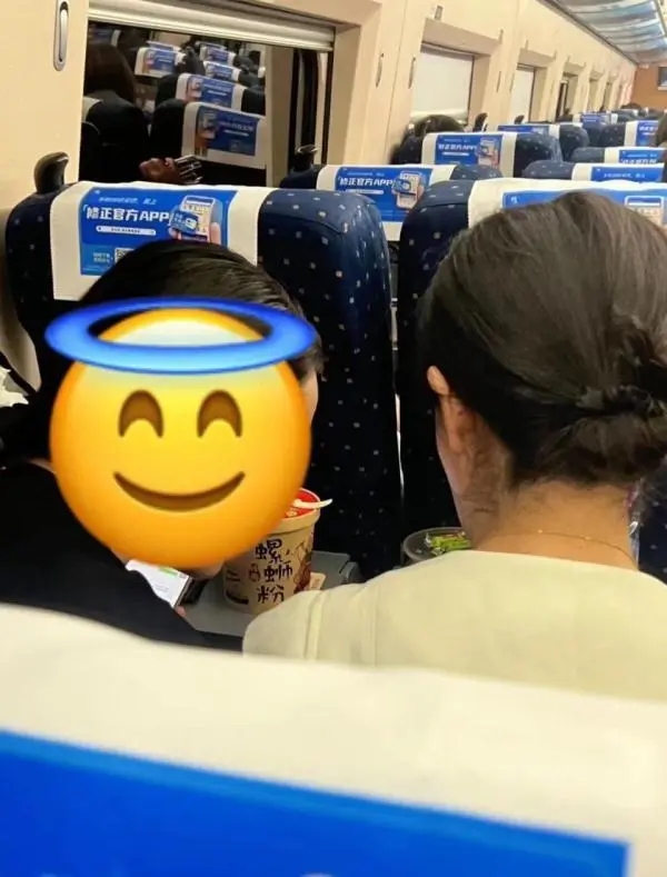 网传视频显示,两位女子并排坐在高铁列车的座位上,鼓着腮帮子咀嚼着食物,而她们身前的小桌板上则各自摆放着一个纸碗。根据该网友提供的照片,两名女子吃的正是可以用开水冲食的速食螺蛳粉。