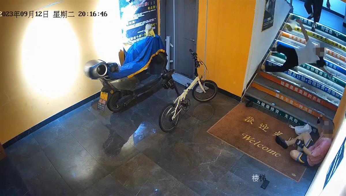 监控视频显示,晚8时11分,一名男子从上方走到楼梯中部时摔倒,起身后发出疑问“怎么都是油啊”。一分钟后,又一名男子摔下了楼梯,趴在地上将近5分钟,缓了一会儿后才艰难起身靠墙坐在地上。这时一名女子走下楼梯,前一名摔倒男子试图提醒未果,这名女子也摔倒并大叫着滑下楼梯。