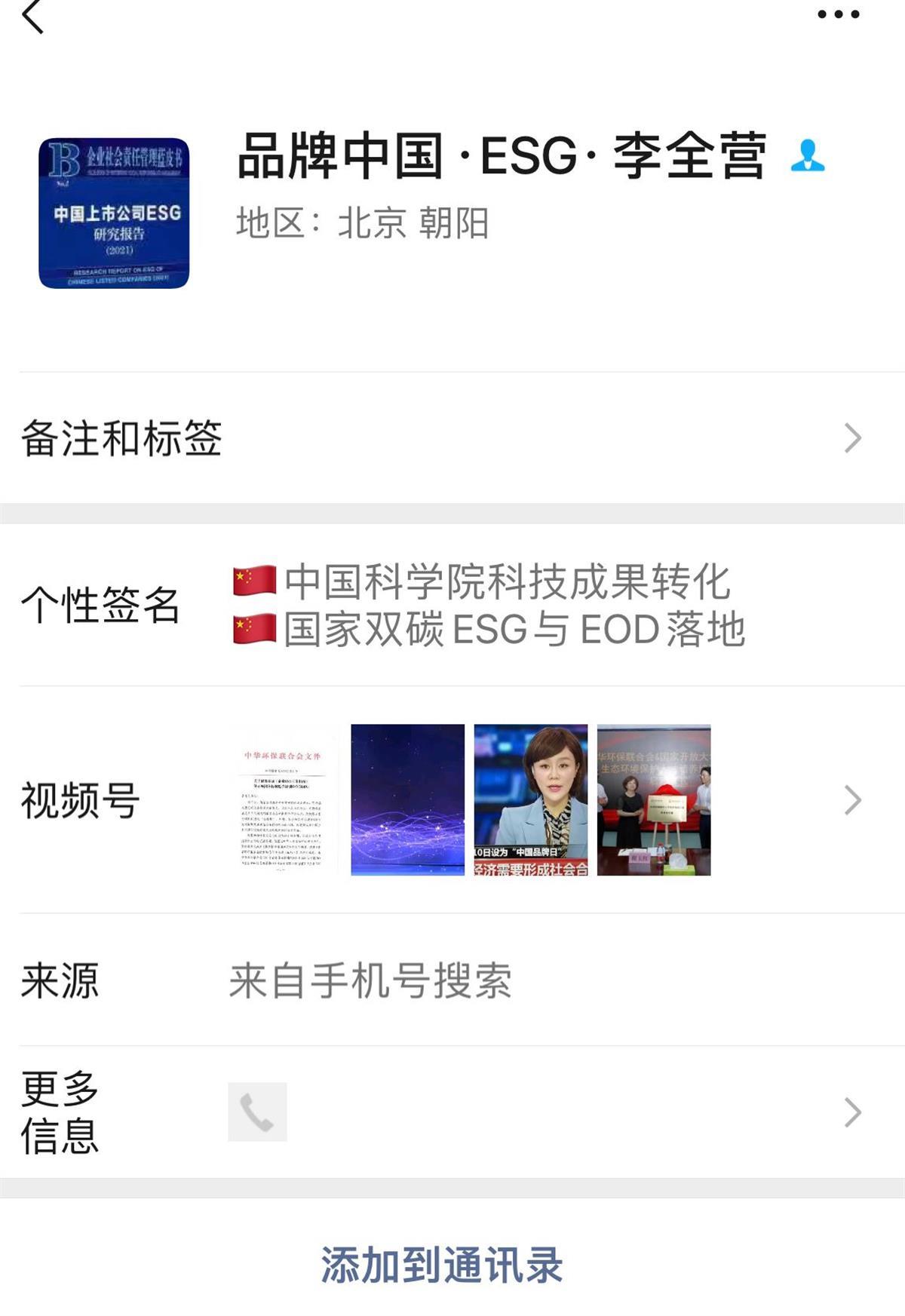 极目新闻记者还拨打了名片上的电话,该号码直接转入语音秘书留言状态。该电话还绑定了微信,微信名片显示“品牌中国·ESG·李全营”,地区位于北京朝阳。