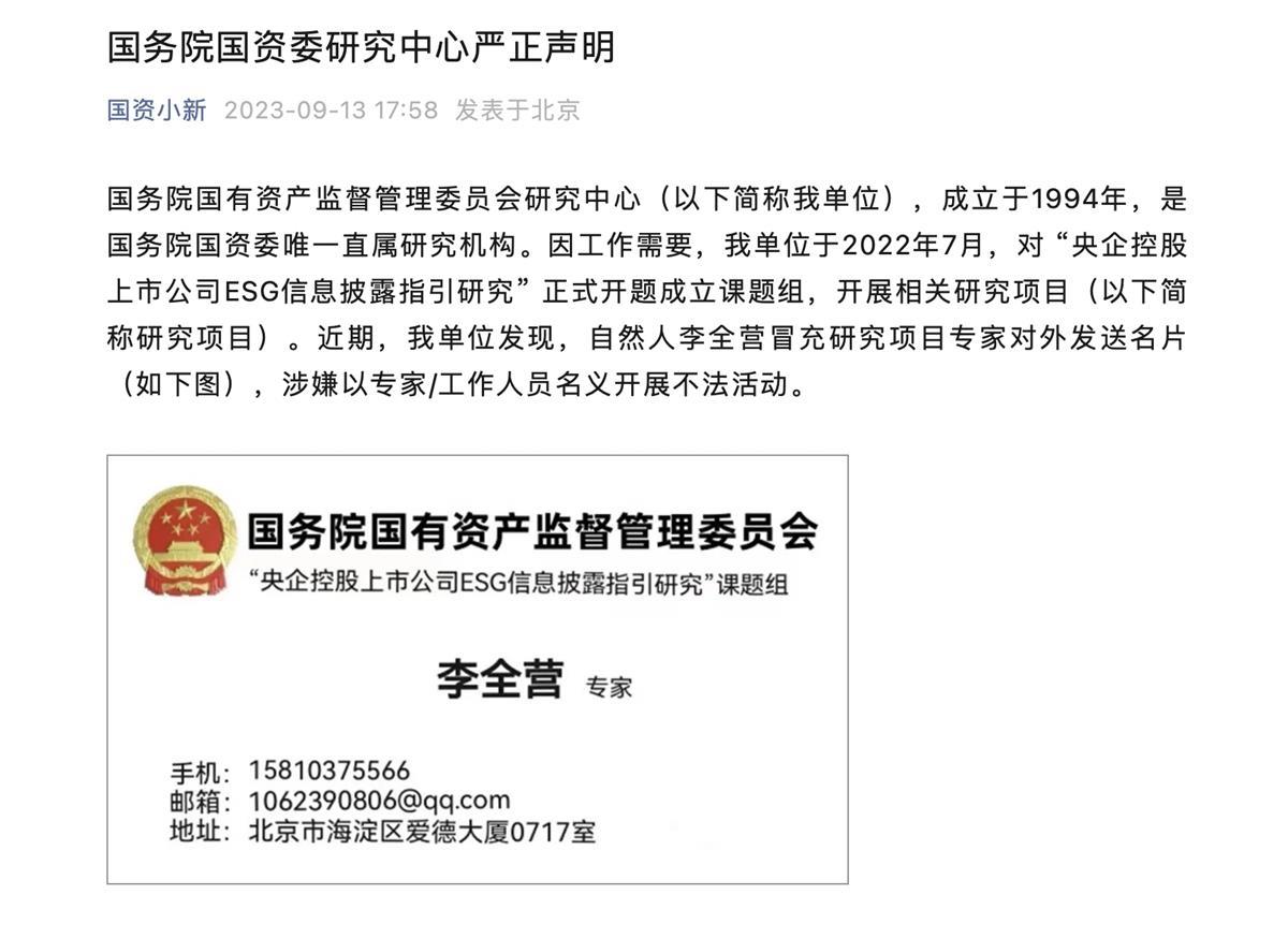 《国务院国资委研究中心严正声明》载明:国务院国有资产监督管理委员会研究中心成立于1994年,是国务院国资委唯一直属研究机构。因工作需要,我单位于2022年7月,对“央企控股上市公司ESG信息披露指引研究”正式开题成立课题组,开展相关研究项目(以下简称研究项目)。近期,我单位发现,自然人李全营冒充研究项目专家对外发送名片(如下图),涉嫌以专家/工作人员名义开展不法活动。