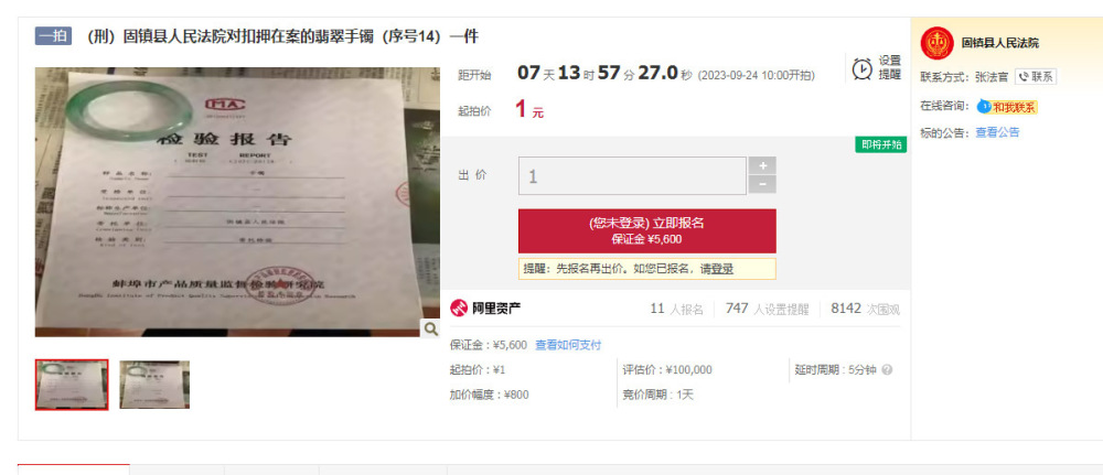 这只翡翠手镯虽然起拍价只有1元,但因为评估价很高,所以要求竞拍者需要缴纳5600元竞买保证金,每次竞拍的加价幅度为800元。虽然离开拍还有几天,但目前已有8000多人围观、700多人设置竞拍提醒,11人报名参拍。其他10件拍品虽没有这只翡翠手镯的受关注度高,但也都已经有人报名参拍。各件拍卖物均需要缴纳竞拍保证金,其中2件评估价为8000元的玉器,也需要缴纳保证金450元。