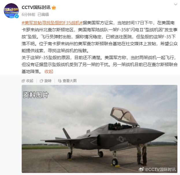据@CCTV国际时讯 微博,据美国军方证实,当地时间9月17日下午,在美国南卡罗来纳州北查尔斯顿地区,美国海军陆战队一架F-35B“闪电Ⅱ”型战机因“发生事故”坠毁。飞行员弹射出舱,据称情况稳定,已被送往医院,但坠毁的这架F-35下落不明。位于南卡罗来纳州的美军查尔斯顿联合基地在社交媒体上发帖,希望公众能提供线索,寻找这架战机的残骸。