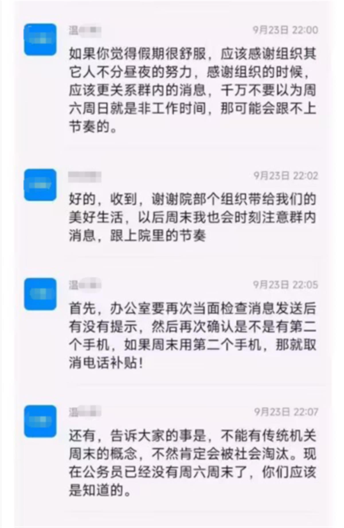 9月25日,一位网友发布的一段群聊聊天记录显示,由于林某等三人没有及时接收到江西某国企建筑设计院院长温某在群里的工作指示,温某在和林某等人沟通时称,“千万不要以为周六周日就是非工作时间,那可能会跟不上节奏的”。