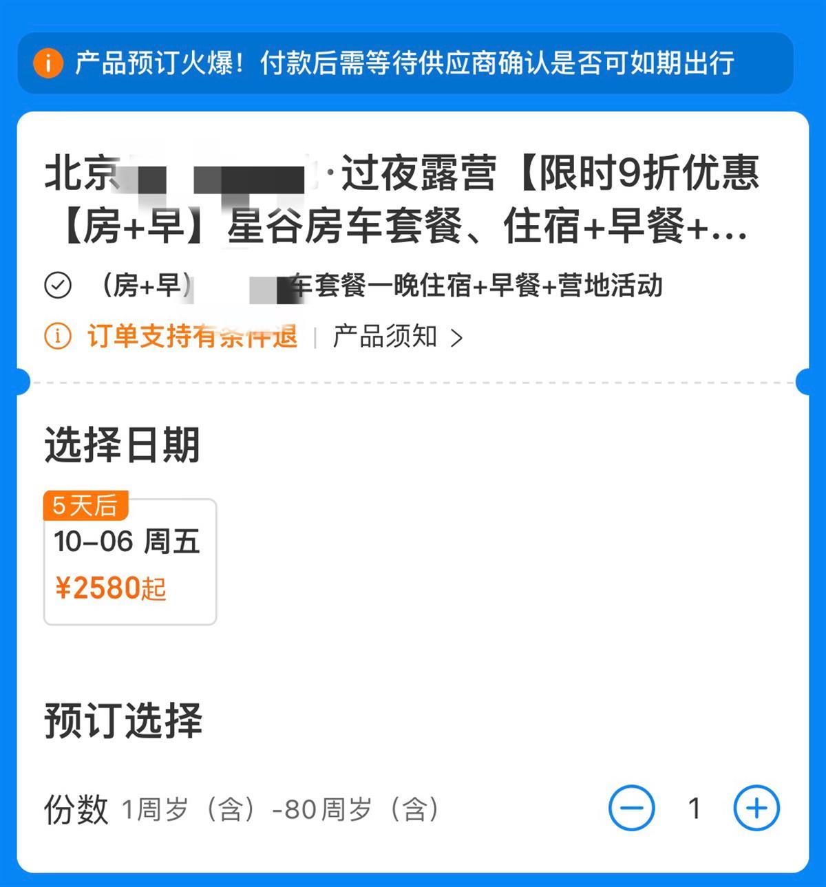 北京延庆区一家热门露营地的房源也十分紧俏。记者看到,该露营地价值1280元和2280元的两种“露营套餐”10月1日至4日均售罄,最早可预约时间为10月5日,而价值2580元和780元的两种套餐更为火爆,预约时间已经排到10月6日了。