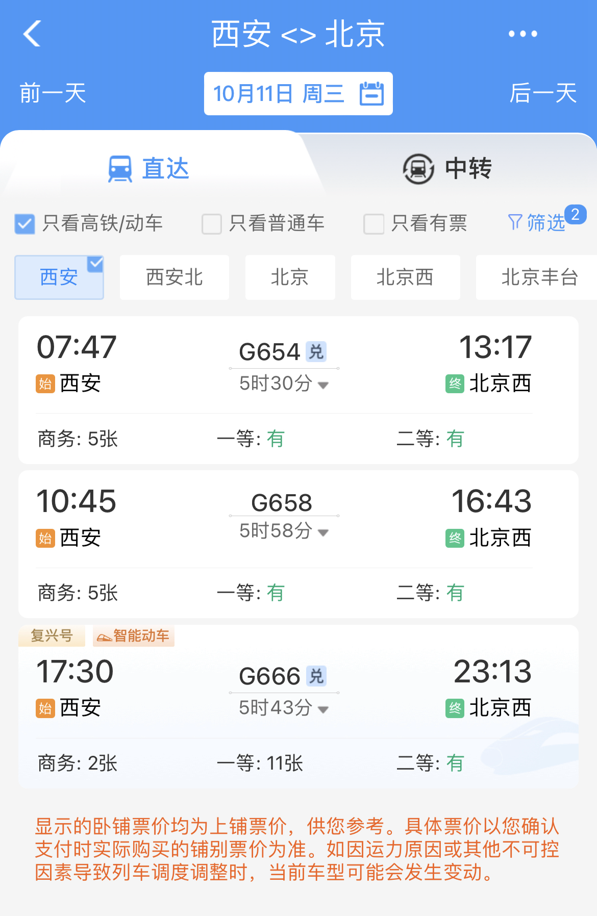 西安至北京西G654次,7:47西安站始发,途经渭南北、三门峡南、郑州东、新乡东、邯郸东、邢台东、石家庄,13:17终到北京西,全程运行5小时30分;