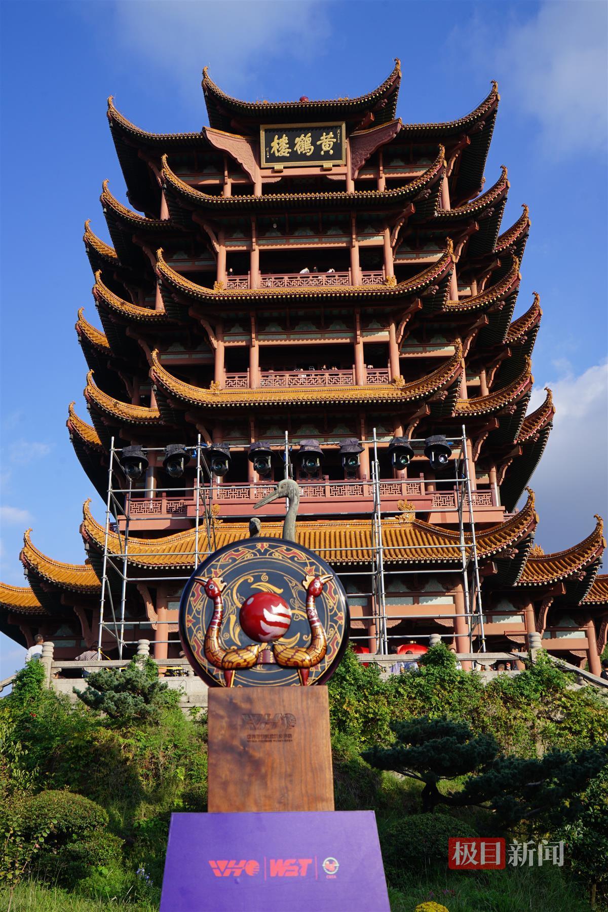 参加奖杯设计制作的师生在黄鹤楼前与奖杯合影