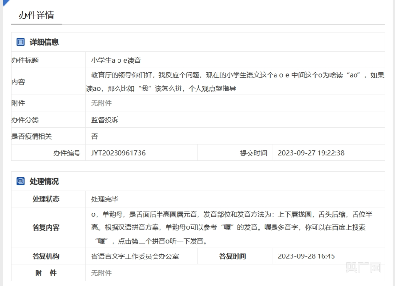 9月28日,山东省教育厅内设机构——省语言文字工作委员会办公室对这个问题进行了回复:根据汉语拼音方案,单韵母o可以参考“喔”的发音。