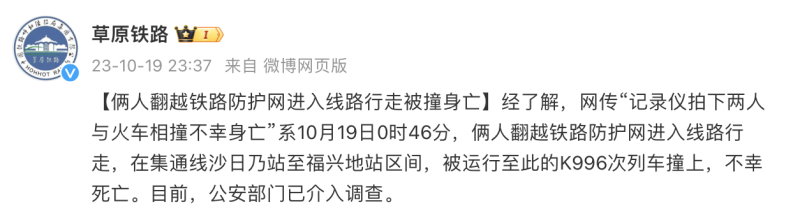 据@草原铁路消息,经了解,网传“记录仪拍下两人与火车相撞不幸身亡”系10月19日0时46分,俩人翻越铁路防护网进入线路行走,在集通线沙日乃站至福兴地站区间,被运行至此的K996次列车撞上,不幸死亡。目前,公安部门已介入调查。