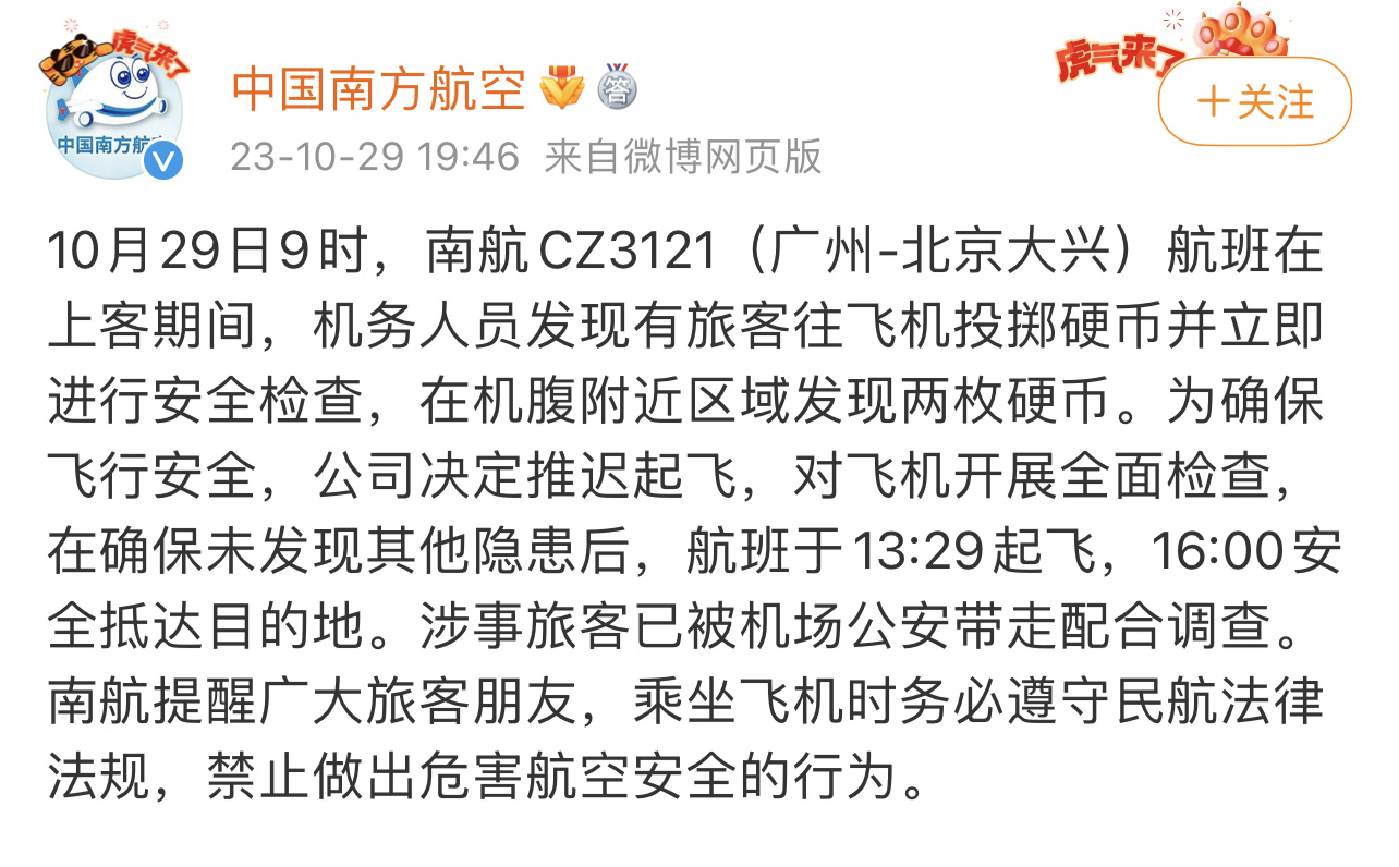 中国南方航空官方微博29日晚间发布通报称,10月29日9时,南航CZ3121(广州-北京大兴)航班在上客期间,机务人员发现有旅客往飞机投掷硬币并立即进行安全检查,在机腹附近区域发现两枚硬币。为确保飞行安全,南航决定推迟起飞,对飞机开展全面检查,在确保未发现其他隐患后,航班于13:29起飞,16:00安全抵达目的地。涉事旅客已被机场公安带走配合调查。