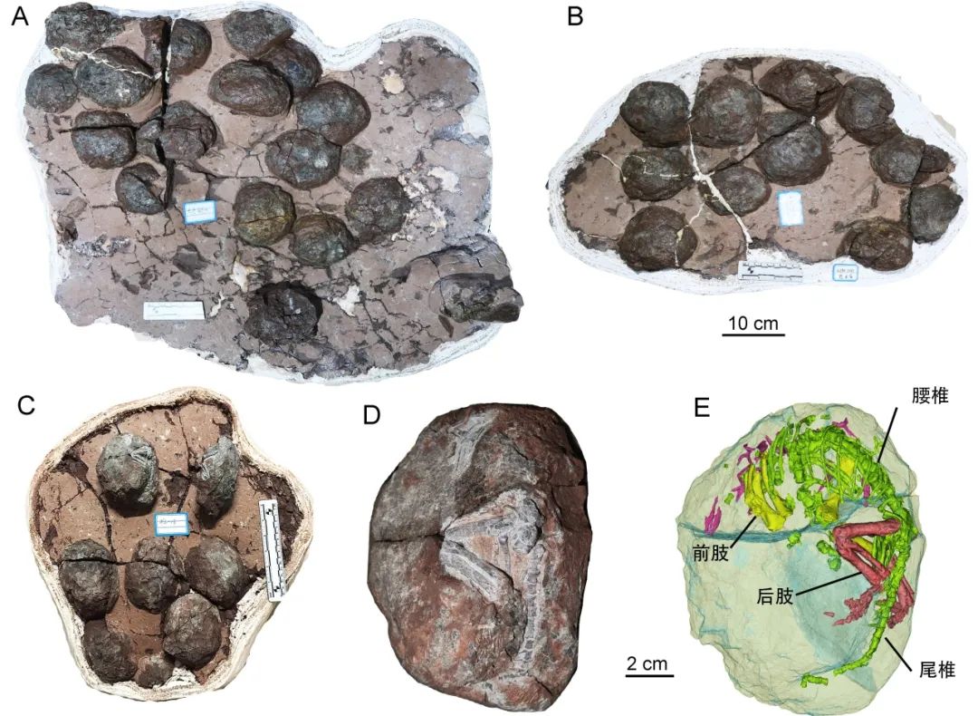 A-C.清理后的恐龙蛋窝;D.一完整保存的胚胎蛋,部分蛋壳被移除;E.显微CT扫描重建后的胚胎骨骼