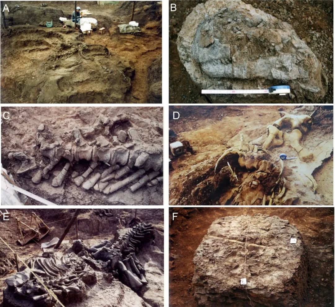 A.局部发掘现场,示一关联骨骼和蛋窝化石(白色皮套壳包裹);B.头骨左外侧视;C.一串尾椎;D.腰带和部分关联背椎;E.完整个体前背侧视;F.一较完整的恐龙蛋窝(未修复)