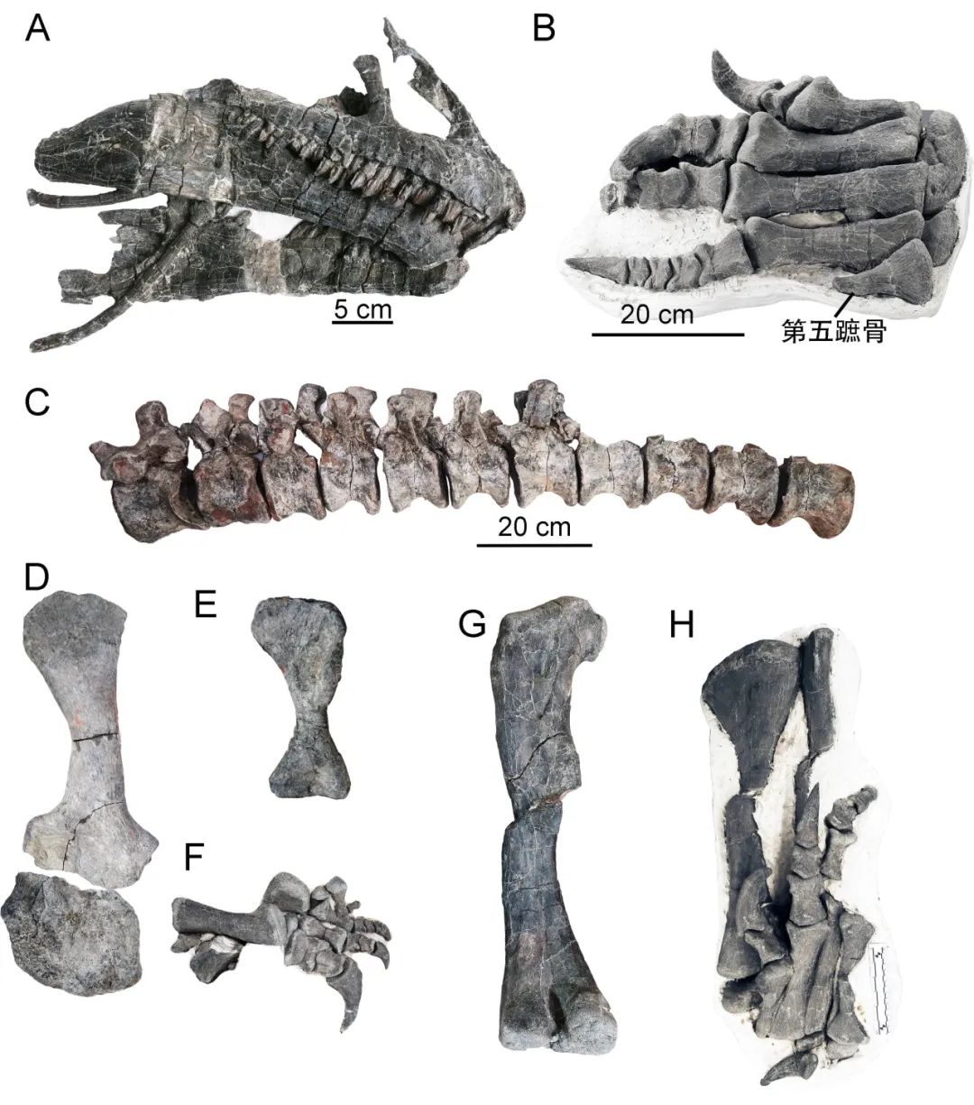A.头骨右外侧视;B.右足骨腹侧视;C.关联的前侧背椎;D.肩胛骨和乌喙骨外侧视;E.肱骨前侧视;F.关联的尺骨、桡骨和掌骨;G股骨后侧视;H.胫骨、腓骨和足骨前侧视.