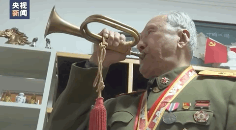 志愿军老战士南启祥虽然已经87岁高龄,但以标准的号兵姿势再次吹响冲锋号时,他依然精气神十足。