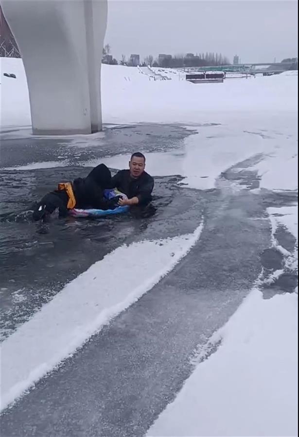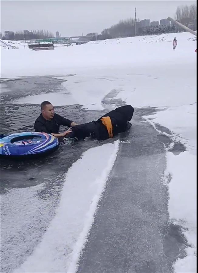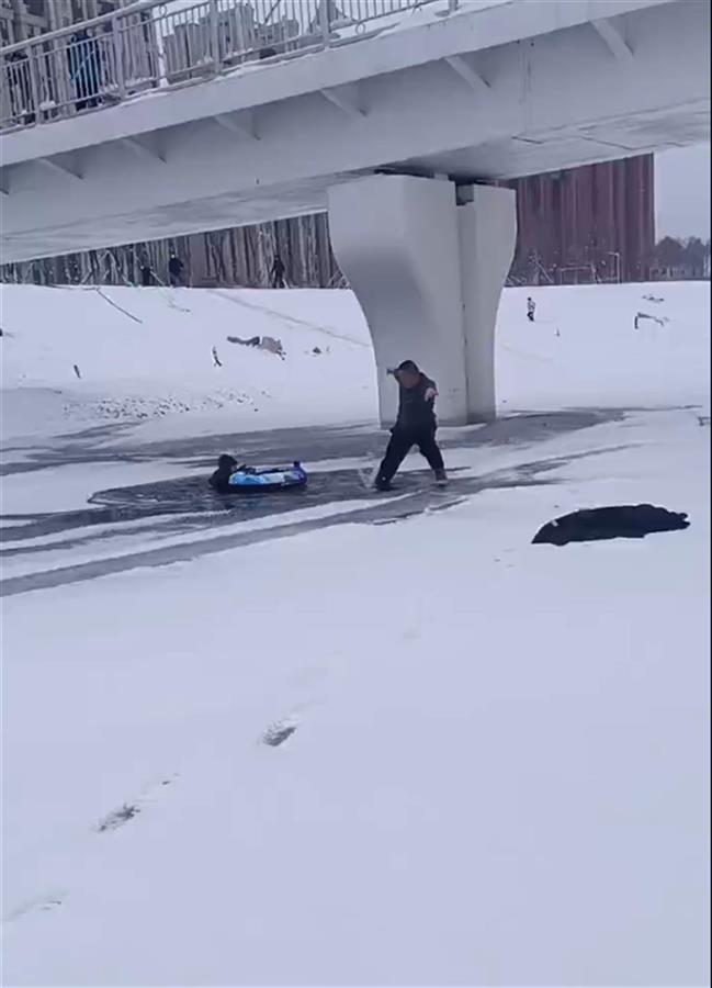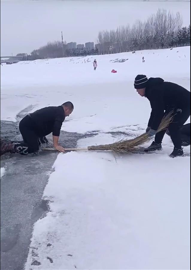 网络视频显示,一条河面已经结冰的河流中,一名男孩掉入一处冰窟窿内,一男子来不及取出身上的手机,直接跳入冰窟窿中,将男孩推上冰面,在其他热心人士的帮助下,男孩和救人男子都成功脱险。