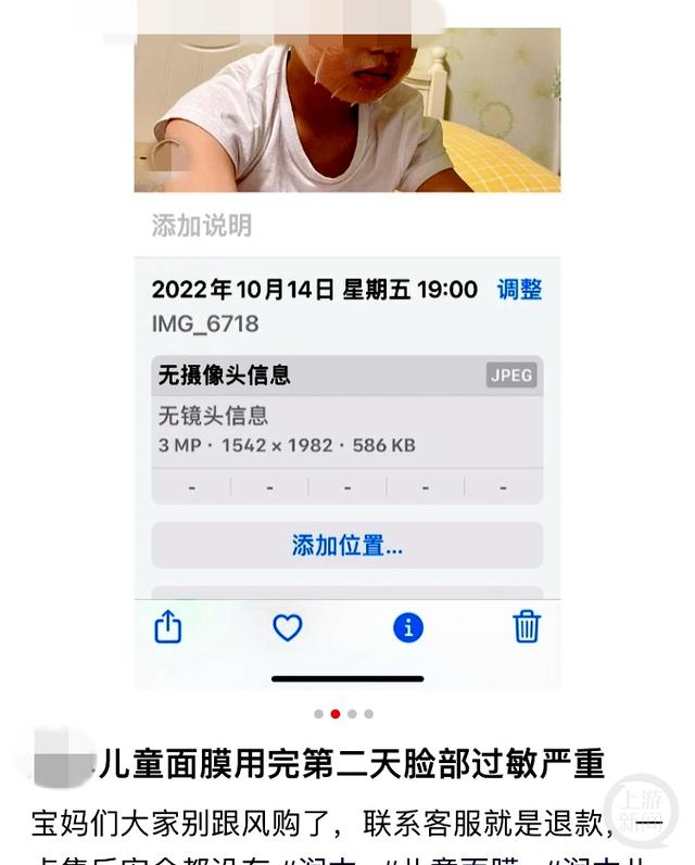 有网友在社交平台投诉某款热门儿童面膜,称孩子敷完面膜第二天,脸部过敏严重。“联系客服就是退款,一点售后安全都没有。”多位网友也同样称,孩子敷完面膜出现过敏反应,“(皮肤)红,还疼”。