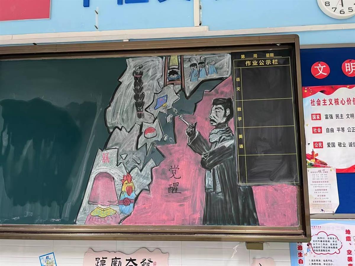 “哇,今天黑板上画的鲁迅太逼真啦!”12月14日早晨,武汉市江汉区红领巾学校CBD校区六年级(8)班的学生简子轩看着黑板上精美的粉笔画,大声地赞叹道。