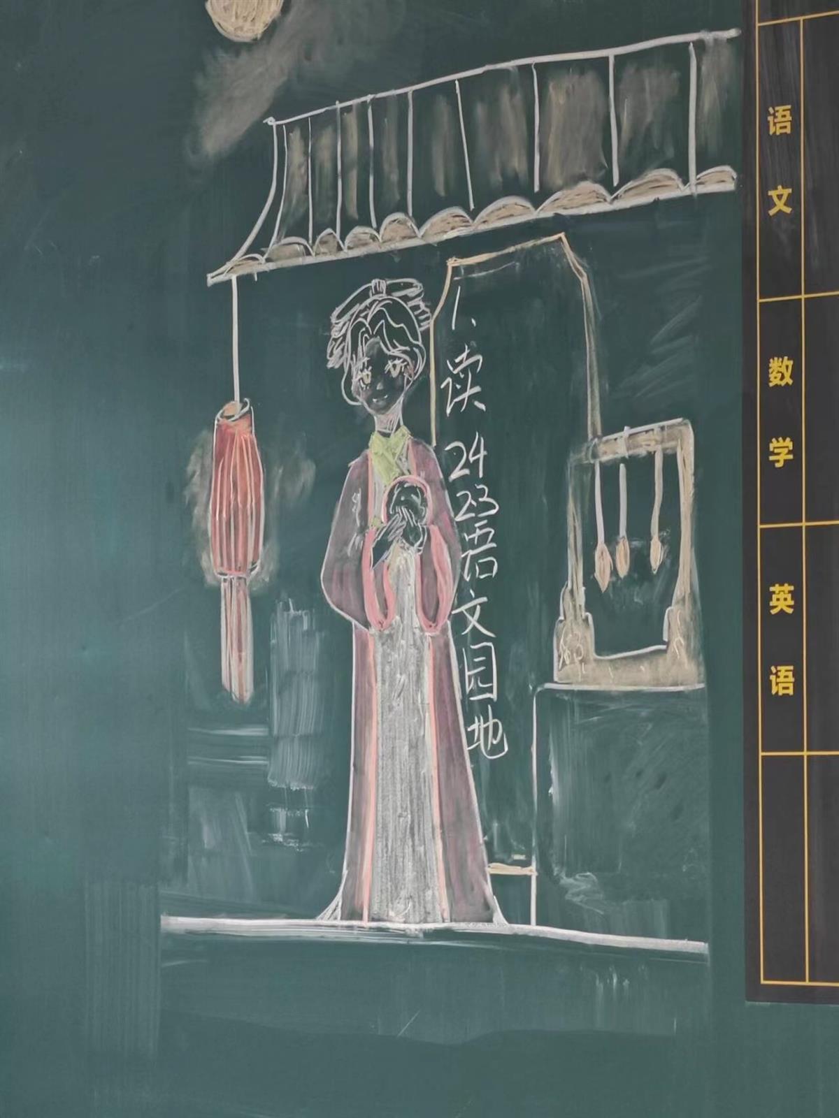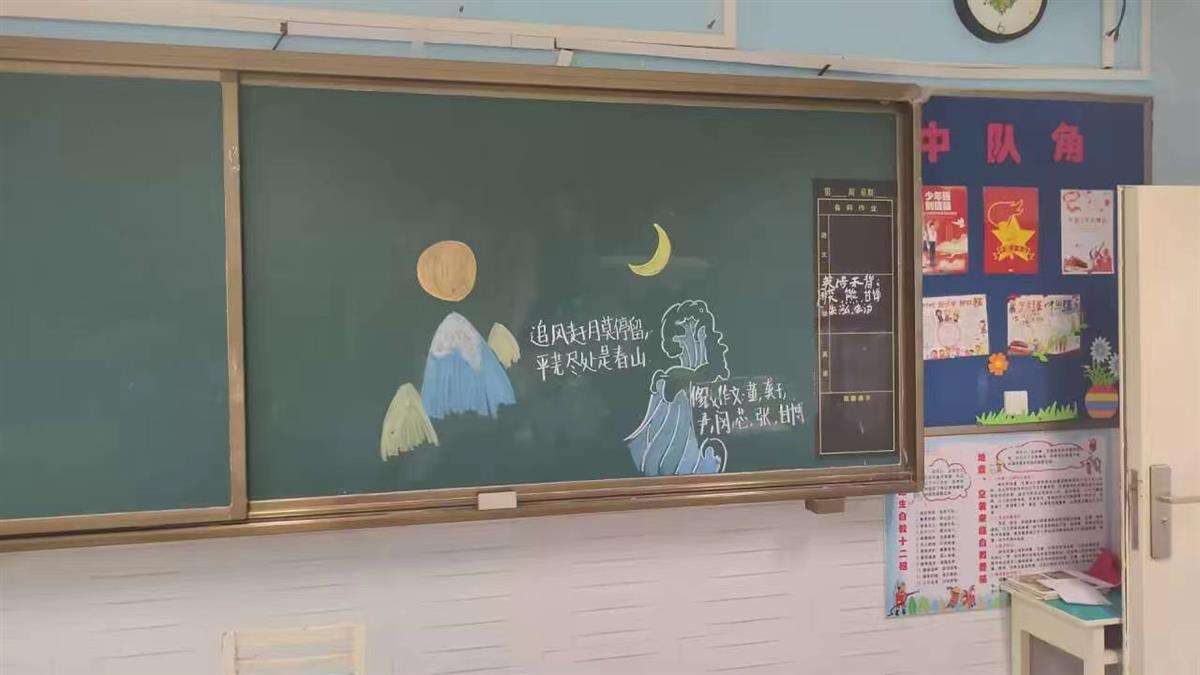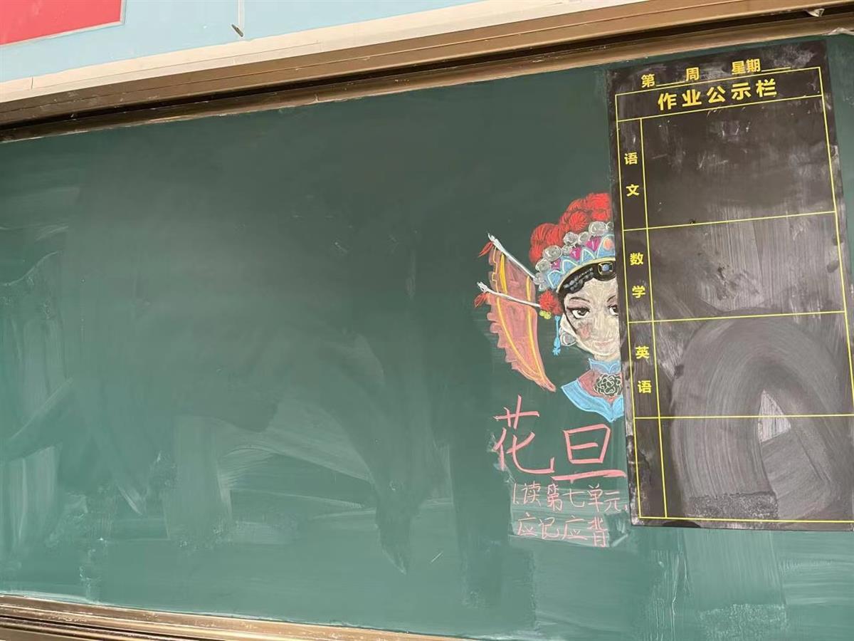 每天下午放学,值日生打扫完班级的卫生后,在黑板上进行创作,有绘画特长的学生还带来绘画粉笔,对黑板进行“艺术加工”。“孩子们每天坚持在黑板上绘画已有两个月,起初根据晨读的内容进行配图,到结合语文学科的单元主题进行创作,再到京剧脸谱和文学作品,创作的内容不仅仅局限于书本上的知识,还从课内延伸到课外,拓展延伸学习内容。”荣雪颖说,因为内容不断更新,画面精美,学生们参与度高,都很期待每天的新画作。