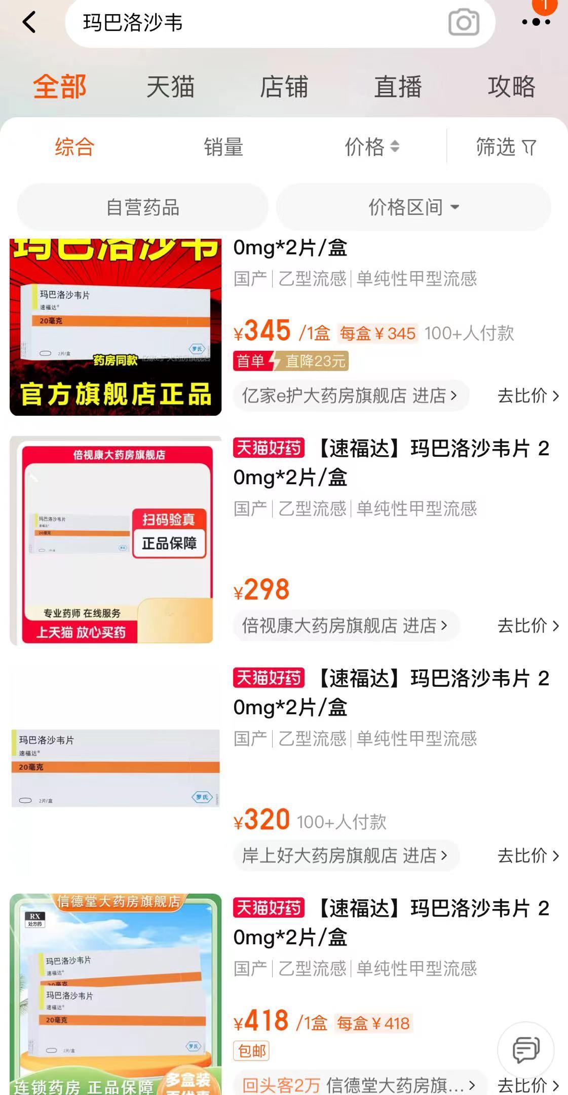 进入流感季后,流感用药需求量大幅增长,玛巴洛沙韦成为继奥司他韦后的“网红”流感用药。红星资本局随机查询多个公立医院药品公示价格注意到,一盒玛巴洛沙韦片(规格:20mg*2片)的售价为222.36元。而在网上购药平台,有药店标出418元/盒的价格,高出医院超87%,单片价格超200元。