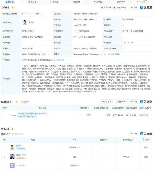 企查查显示,与辉同行(北京)科技有限公司于2023年12月22日成立,注册资本1000万元,董宇辉为法定代表人、执行董事、经理,新东方教育科技集团有限公司主席俞敏洪担任监事,最终受益股份为99%。公司经营范围包括互联网信息服务,日用品批发,鲜肉、新鲜水果等多类产品零售,此外还包括演出经纪、营业性演出、旅游业务等。