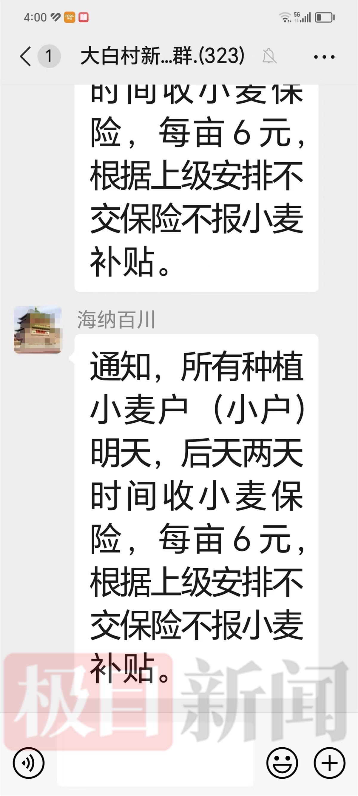 1月12日,邹平市韩店镇大白村村民刘先生(化姓)告诉极目新闻记者,1月11日,大白村村委会负责人郭某在村民微信群发布通知,要求所有小麦种植户(小户)这两天缴纳小麦保险,每亩6元。通知还称,根据上级安排,不交保险就不报小麦补贴。