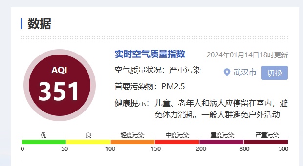1月14日,湖北接连发布多条大风和雾霾预警。晚上6点,湖北北部普遍处于重度污染中,武汉、黄石、孝感、鄂州为严重污染!其他地区除神农架、恩施外,为轻到中度污染,公众外出需做好防护措施。