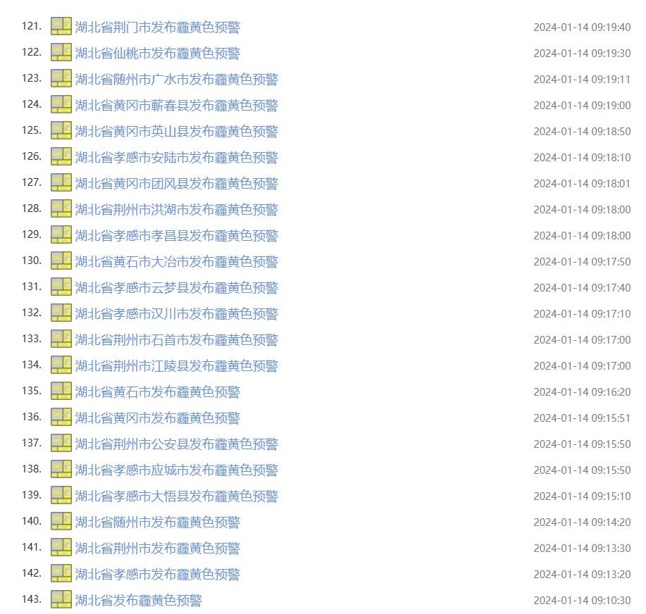 截至晚上6点,湖北已累计发布143条气象预警,其中半数为大风蓝色预警,半数为霾黄色预警。