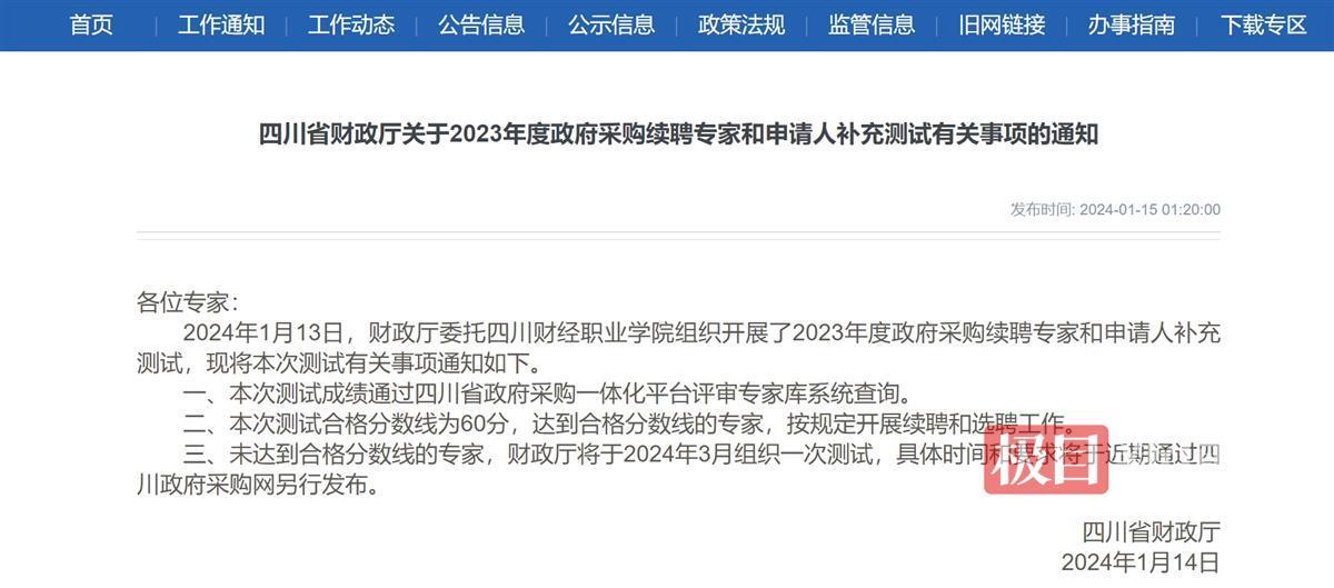 1月15日凌晨1时许,四川政府采购网发布了一则《四川省财政厅关于2023年度政府采购续聘专家和申请人补充测试有关事项的通知》,通知显示,2024年1月13日,财政厅委托四川财经职业学院组织开展了2023年度政府采购续聘专家和申请人补充测试,现将本次测试有关事项通知如下:一、本次测试成绩通过四川省政府采购一体化平台评审专家库系统查询。二、本次测试合格分数线为60分,达到合格分数线的专家,按规定开展续聘和选聘工作。三、未达到合格分数线的专家,财政厅将于2024年3月组织一次测试,具体时间和要求将于近期通过四川政府采购网另行发布。