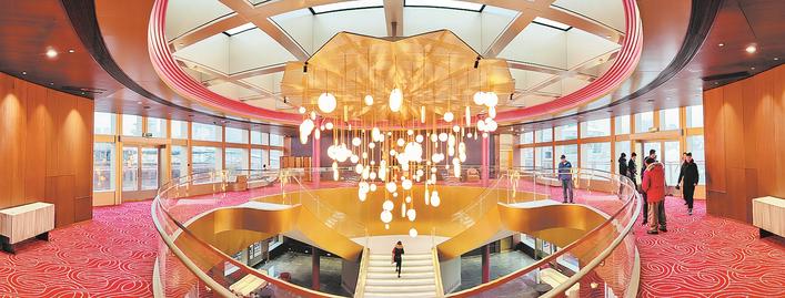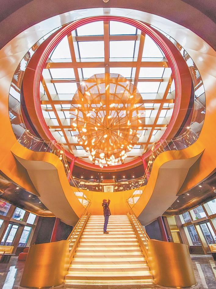 “古琴号”最终停靠在武汉港码头。极目新闻记者在现场看到,穿过古铜色金属大门,进入一楼船舱大厅,目光所及之处皆是晶莹璀璨、流光溢彩,仿佛步入光影世界。一楼有宽敞的宴会大厅,清新靓丽的地毯、挂满水晶吊灯的天花板、超宽高清电子屏等,能满足各种会议、宴会、娱乐需求,船两侧还有室外长廊供游客观景打卡。二楼主要以包房为主,10间包房风格各异,低调奢华的装修风格,提供更雅致的聚会观景空间。三楼是全通透露天观景平台,可尽情饱览两岸美景,平时可做咖啡吧、酒吧,还可举行派对、年会、婚礼等各种仪式。