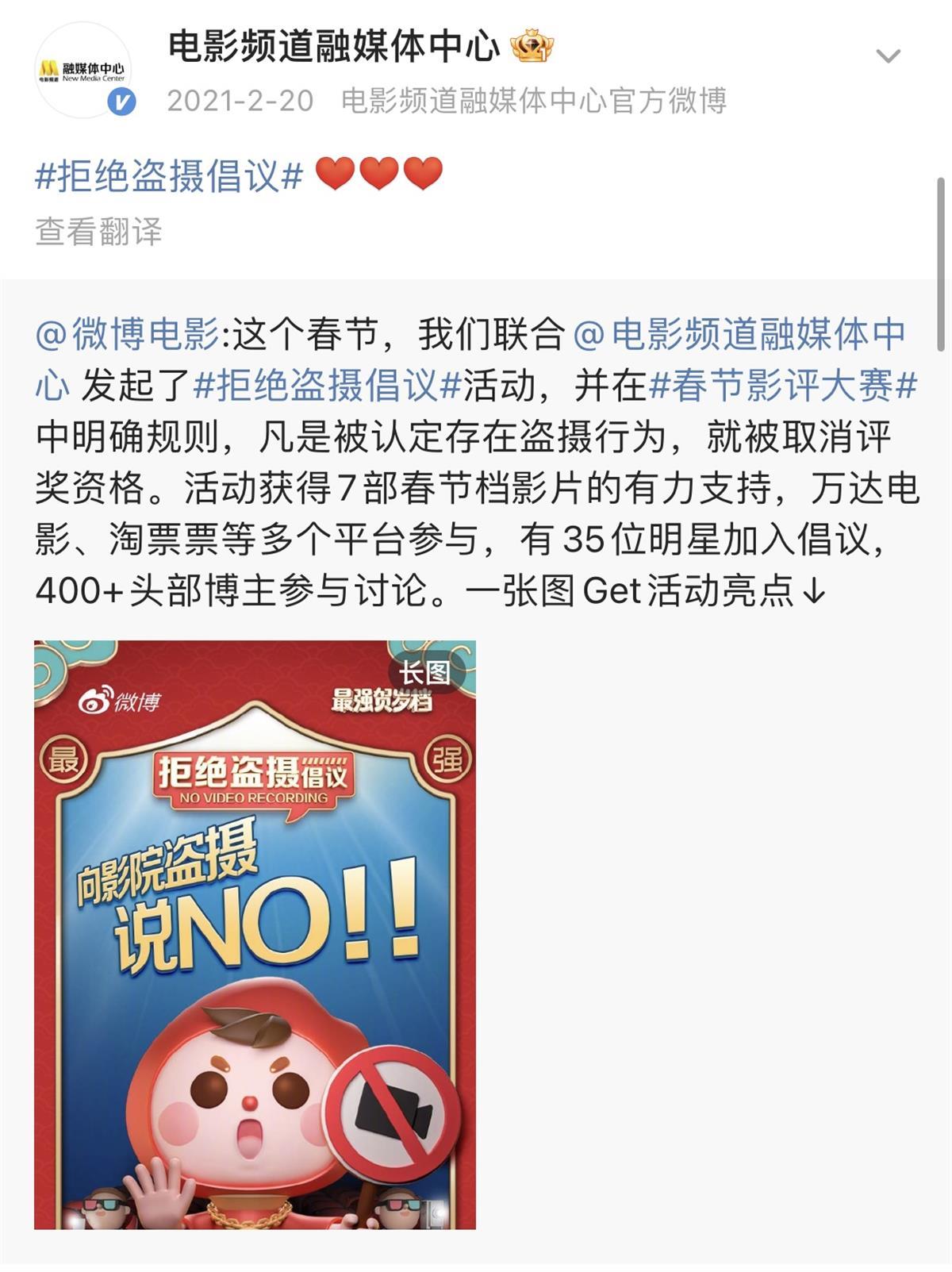CCTV-6电影频道融媒体中心曾发起“拒绝盗摄倡议活动” (来源:CCTV6官微)