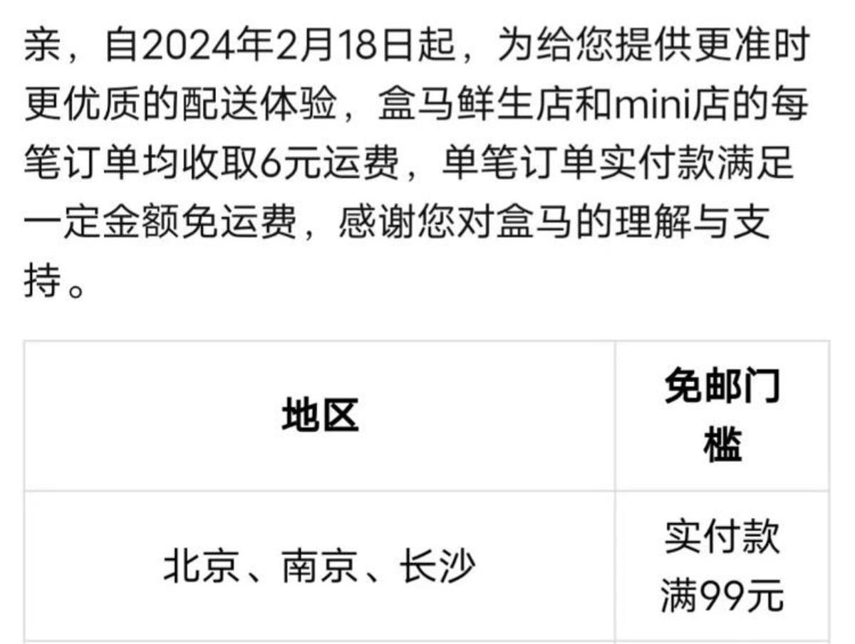 据了解,今年春节前,盒马曾发布意见征集公告,拟将北京、上海、广州25个城市的免运门槛由49元或39元涨至99元。有网友吐槽涨价太多后,盒马将提高免运门槛的城市改为北京、南京、长沙三地。目前,上述三城一小时达的免运门槛于2月18日起正式上调,未达到99元将收取6元运费;盒马X会员在存续期间,可继续享受每天一次免运费权益。