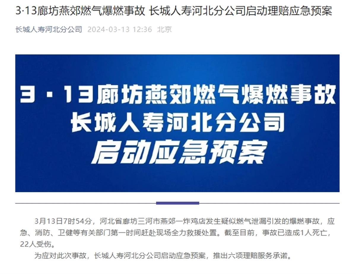 另外,针对爆燃事故中造成的人身伤害,13日中午,长城人寿河北分公司宣布启动应急预案,推出六项理赔服务承诺,其中包括简化理赔申请资料、简化伤残认定手续等措施。