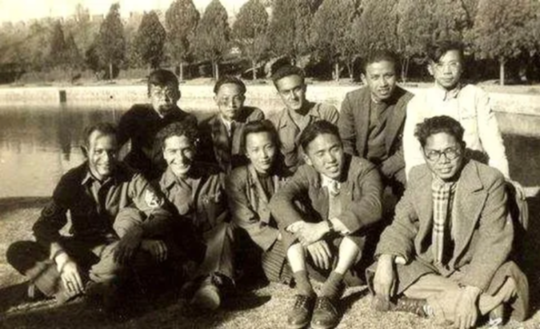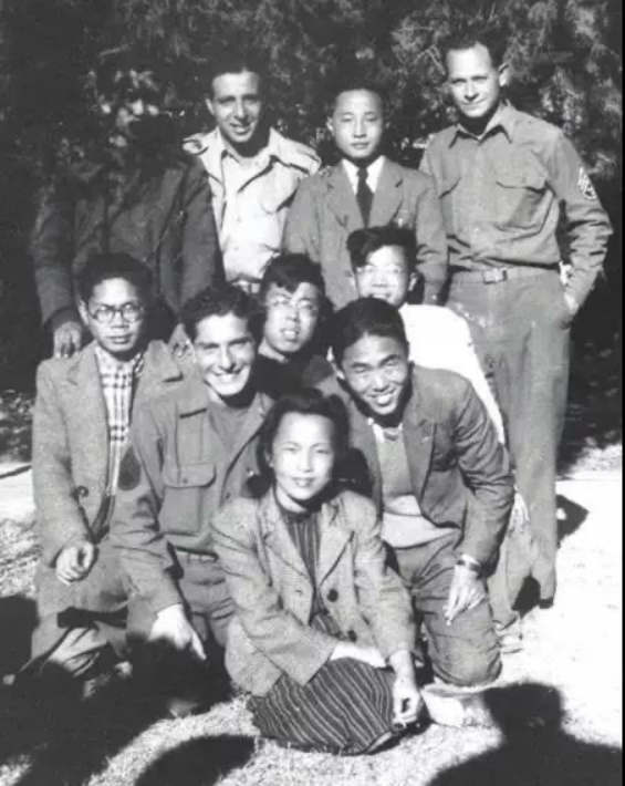 马识途(前排右一)等西南联大同学与美国飞虎队员合影,后排左一许乃炯为当时“民青”第二支部总务委员