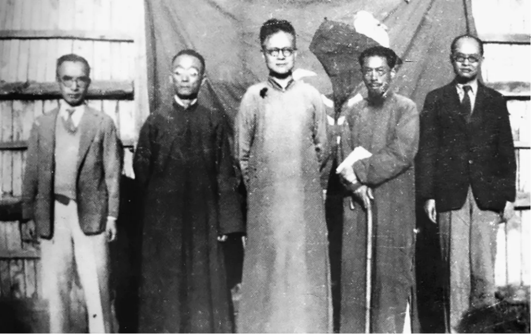 1940年,西南联大中文系教授在昆明北郊大普吉镇合影,左起朱自清、罗庸、罗常培、闻一多、王力