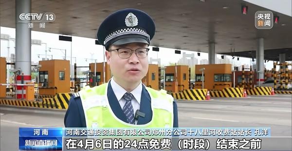 河南交通投资集团有限公司郑州分公司十八里河收费站站长孔洋:在4月6日的24点免费时段结束之前,一定要合理安排自己的下收费站时间。最好能提前10到20分钟,在就近的收费站下高速,享受这个24点之前的免费路段,然后再重新上高速。