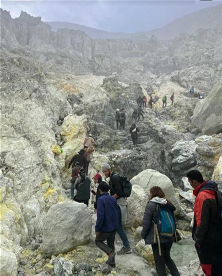 记者注意到,不少国内游客曾在平台分享自己游览伊真火山的经历。游客一般是凌晨从大门出发,先徒步爬山,来到山崖边,然后顺着山崖向下攀爬,下到湖边去观看蓝色火焰。由于湖边不停有烟雾喷出,游客一般都戴着防毒面罩。还有人专门在浓浓的烟雾中戴着防毒面罩拍照。到了天快亮时,无法再看到蓝色的火焰,游客又会原路返回,爬上山崖看日出并俯瞰湖景。日出观看点有光秃秃的树,不少游客晒出自己站在树边打卡的照片,还有人甚至直接站在树上或躺在树上,而树背后就是悬崖。因为伊真火山位于自然保护区,游客称从火山口攀爬到湖边全是乱石,没有任何栈道,还有人在攀爬时擦伤手臂。有人感叹这条线路是“特种兵中的特种兵”。还有人称,现场人挤人,吸一口硫磺烟雾整个人很难受。不少网友还称这里为“地狱之门”。